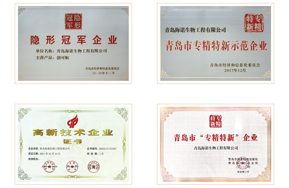 海氏海諾集團先后獲得青島市守合同重信用企業、青島市優秀民營企業、中國醫用敷料行業杰出品牌、中國優秀民營企業、中國醫療器械行業最具創新活力競爭力前三強企業、中國馳名商標、山東省高端品牌培育企業、山東省“品質魯藥”建設示范企業、國家級“專精特新”小巨人等榮譽和獎項。