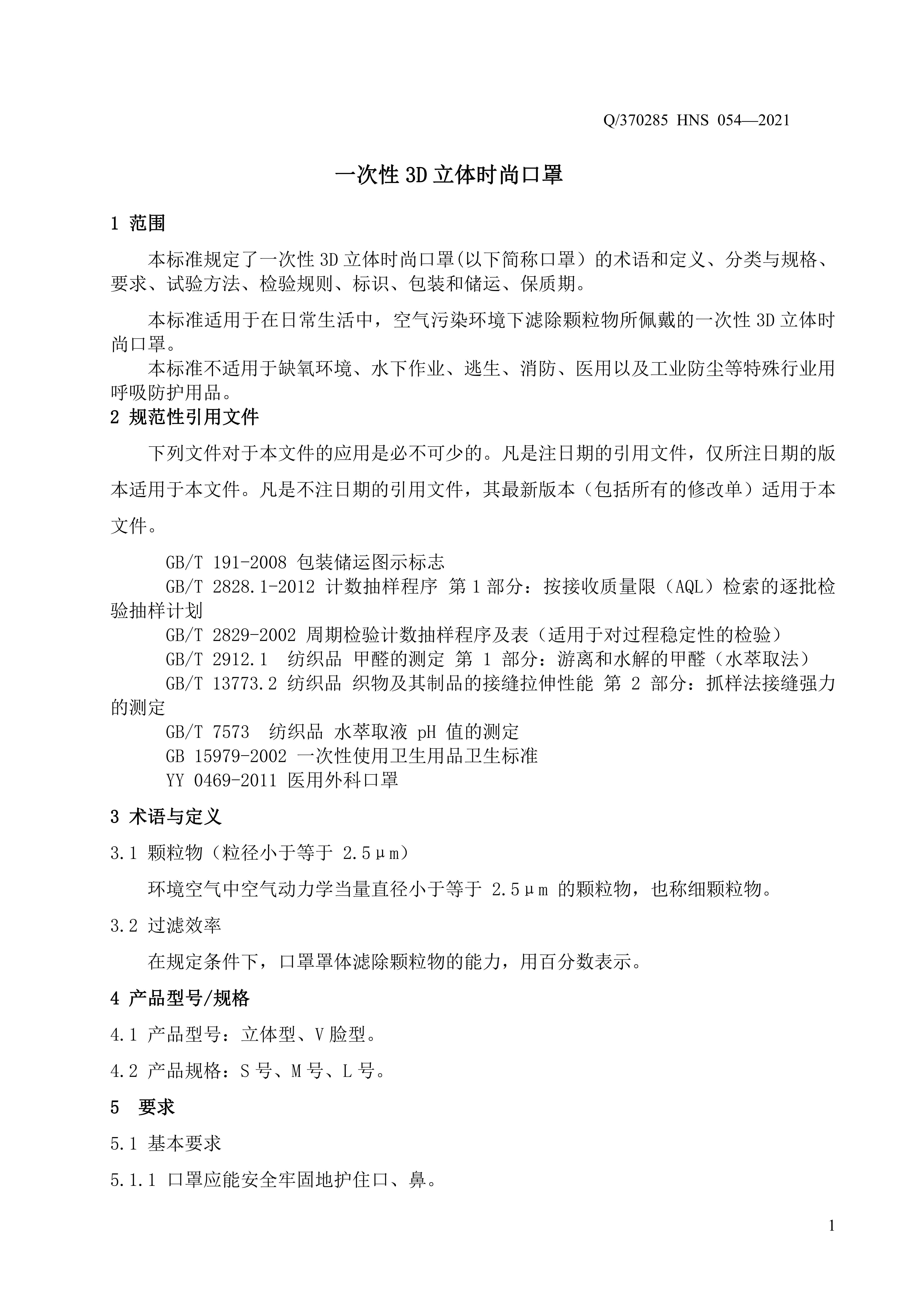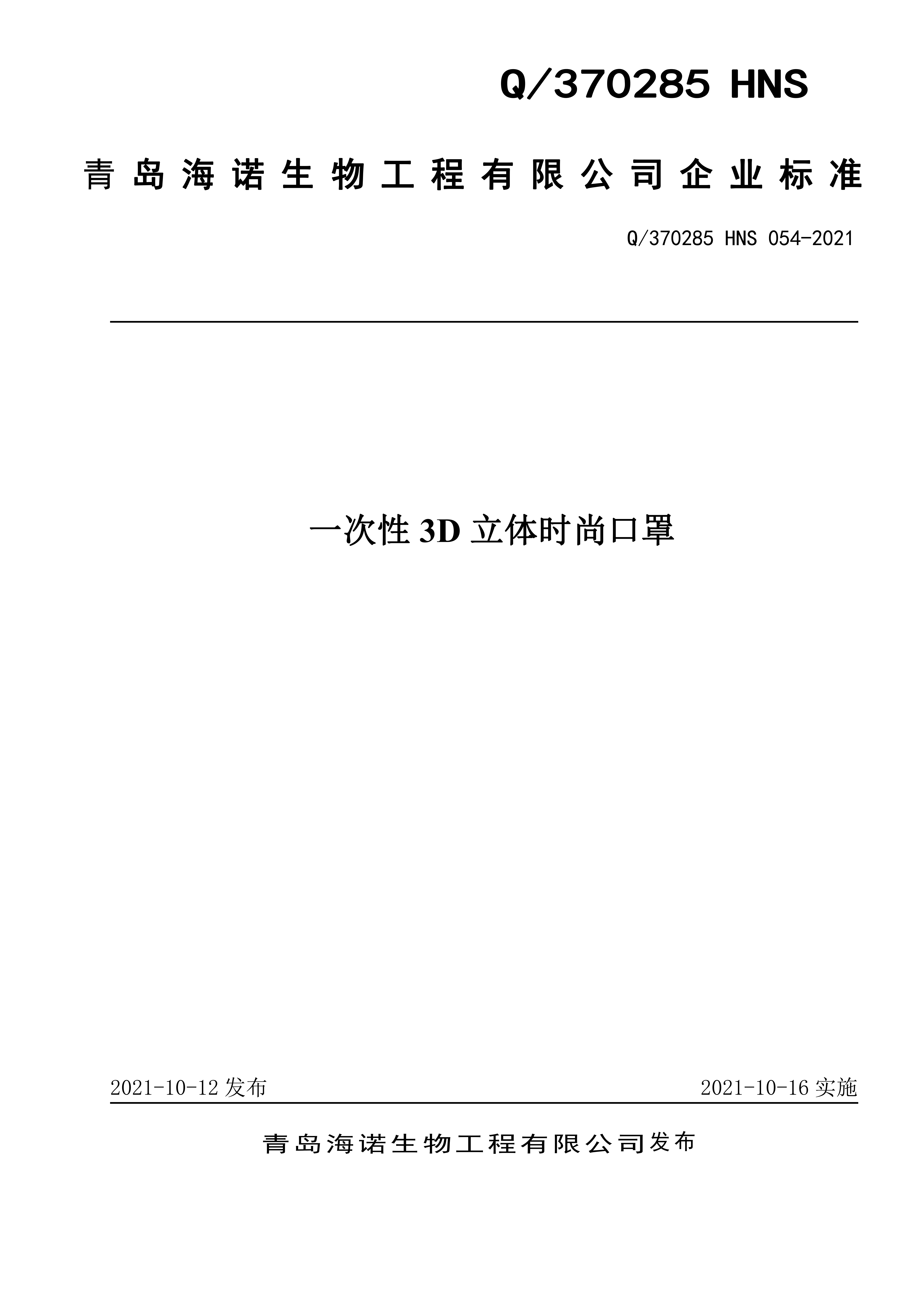 青島海諾生物工程有限公司企業(yè)標準 — 一次性 3D 立體時尚口罩