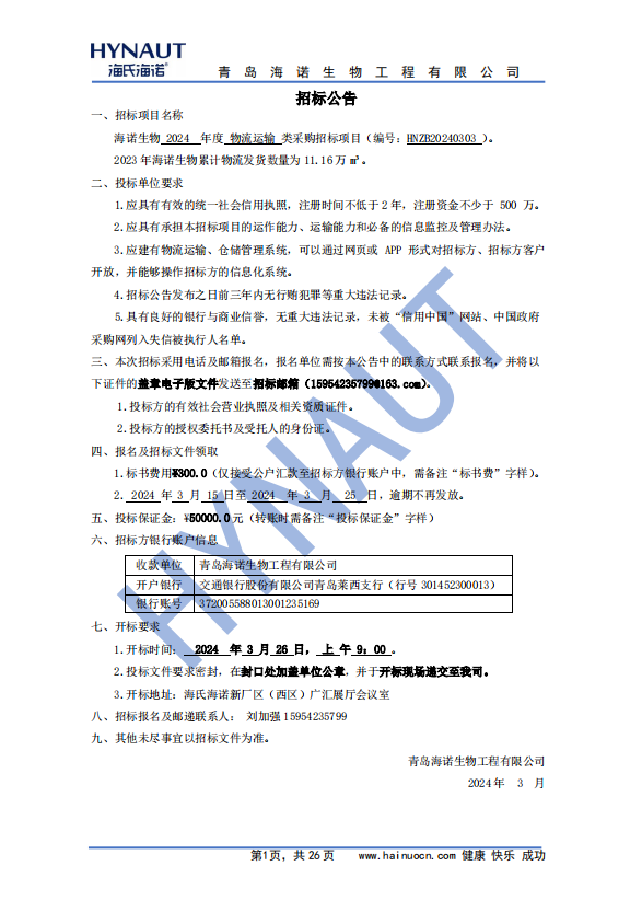 2024年度海諾生物物流運(yùn)輸類采購(gòu)招標(biāo)公告